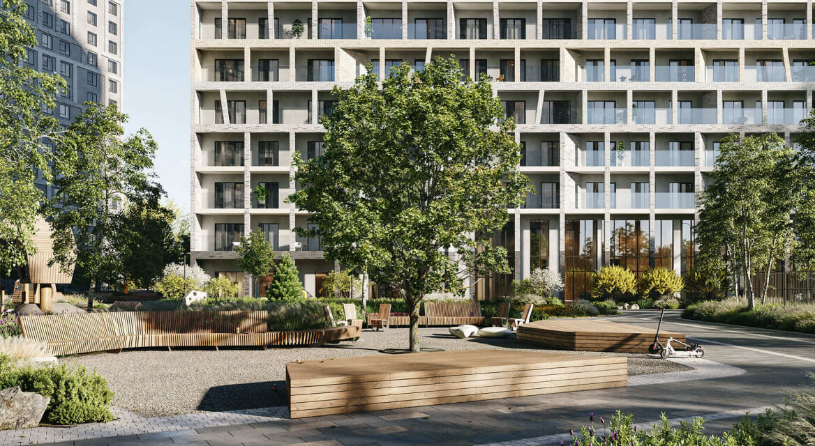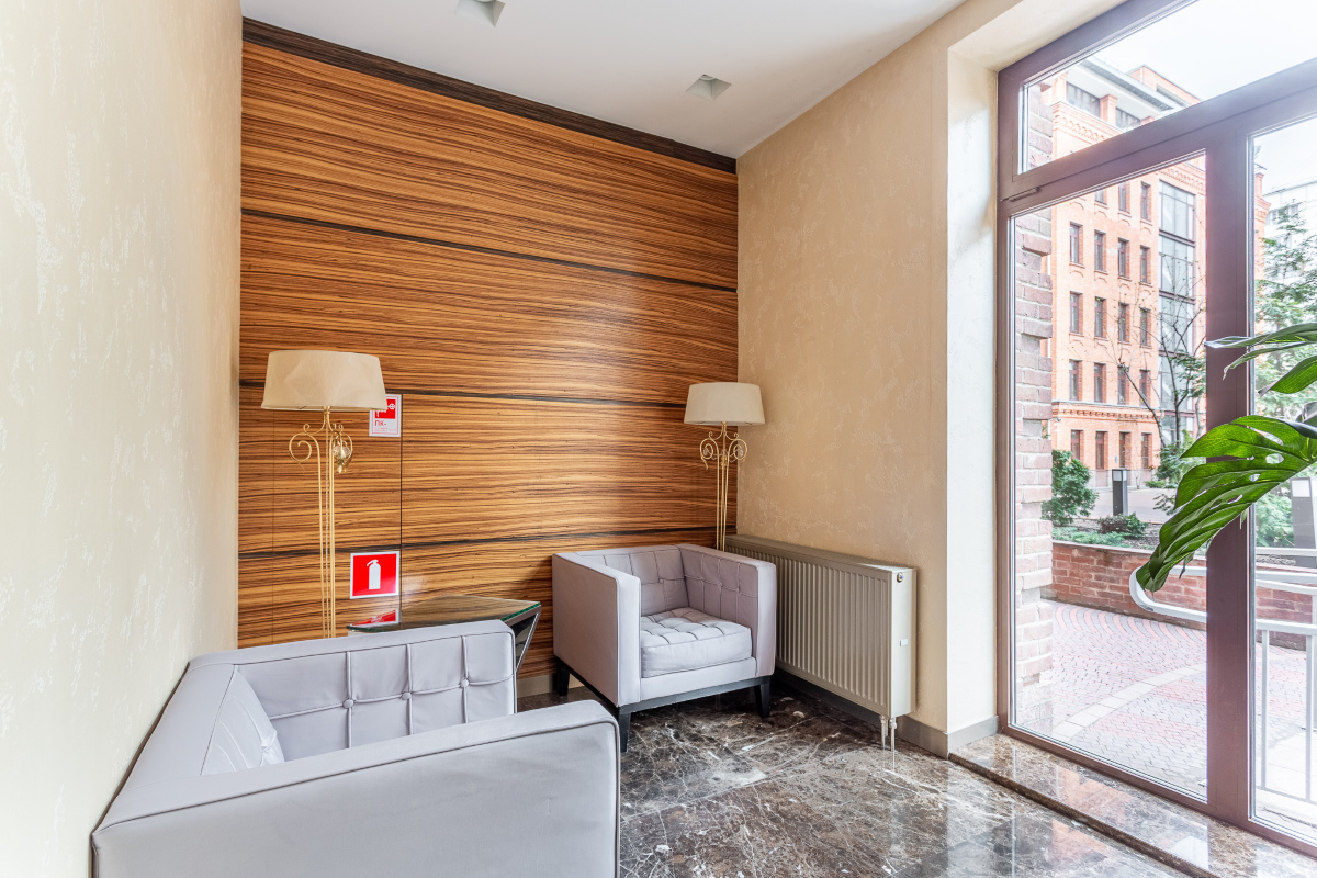 На первом этаже ЖК Трилогия расположены элегантные лобби в стиле ар-деко, в отделке которых использовали мрамор и ценные породы дерева. Для гостей предусмотрены уютные зоны ожидания, за стойкой ресепшн дежурит консьерж, которому можно доверить любой бытовой вопрос. Во внутреннем дворе для жильцов построена беседка, где всегда можно отдохнуть и спрятаться от городской суеты, пока малыши играют на оборудованной игровой площадке. Всюду высажены кустарники, газоны, проложены прогулочные дорожки, установлены скамейки.
